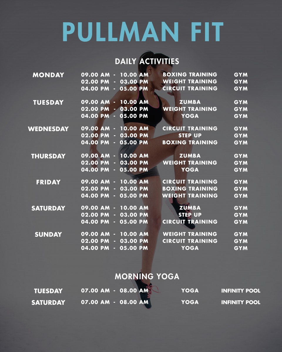 Welcome to Pullman FIT, your go-to place for an invigorating workout experience. Located on the 1st floor and open 24/7 exclusively for in-house guests, we offer a well-equipped space with state-of-the-art fitness machines. Join our vibrant Pullman FIT classes, including Zumba, Yoga, and Boxing, conducted in our spacious and dynamic environment. Get ready to sweat it out and embrace the energy at Pullman Bali Legian Beach!